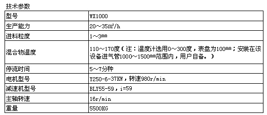 WX1000型该机用于型焦煤厂原料加热工段,将经过粉碎处理的混合原料搅拌混合,用于蒸汽均匀加热,达到柔练和熟化,并提高原料的成型塑性。